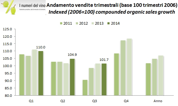 • Le vendite consolidate del terzo trimestre sono cresciute del 7% a 1.54 miliardi di dollari, e si compongono di 685 milion di dollari di vendite di vino (-4%), 88 milioni di vendite di superalcolici (+26%, grazie a nuovi flavours di vodka e all’introduzione della Tequila) e 768 milioni di vendite di birra (+16%).