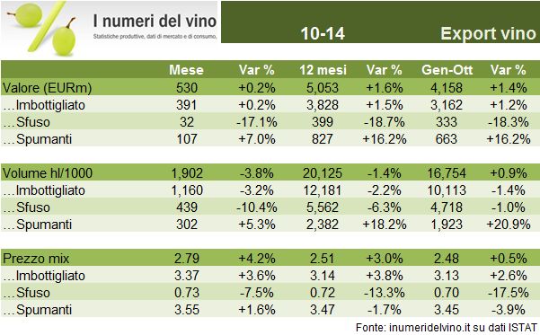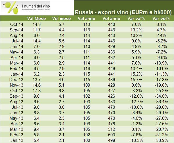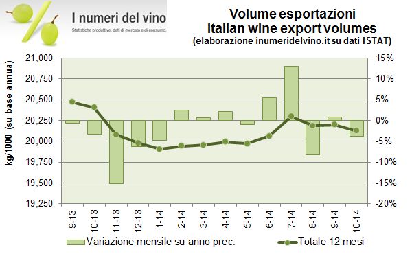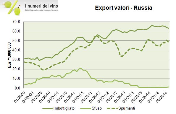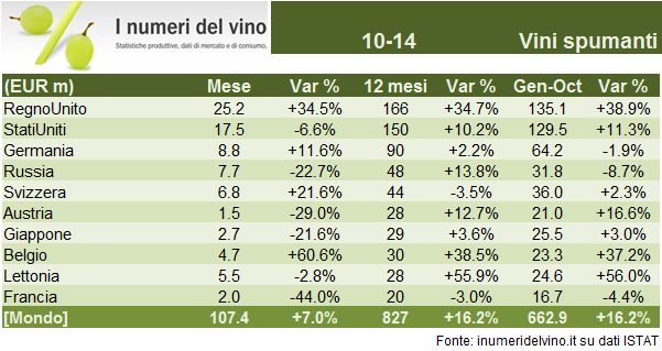 Le esportazioni di vino di ottobre, il primo mese « spumantistico » sono rimaste esattamente stabili rispetto allo scorso anno. Ci avviamo ad affrontare un periodo interessante, caratterizzato da una forte turbolenza sui cambi, questa volta favorevole. Per mettere il dito nella piccola piaga che comunque c’e’, oggi metto in linea gli ultimi dati della Russia, che sara’ un osservato speciale nei prossimi mesi data la svalutazione del rublo. Per restare sui numeri del momento, il calo dei vini sfusi viene compensato dai vini spumanti, dove si ravvisano anche segnali di miglioramento nel mercato cinese, sinora un’area appannaggio soltanto dei vini imbottigliati. Andiamo ad analizzare i numeri insieme.