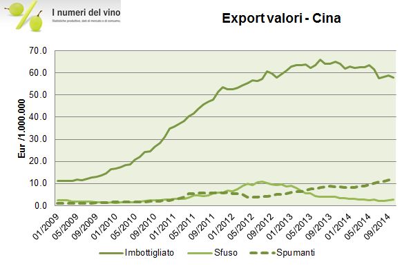 - Concentrandoci per un momento sulla Russia, non possiamo non notare il primo calo significativo di Ottobre, -17%, guidato sia dagli spumanti che dai vini imbottigliati. C’e’ da aspettarsi che le cose possano ulteriormente peggiorare. Vi allego anche il grafico della Cina dove invece il cambio si sta girando a nostro favore e dove sembra che le esportazioni stiano cominciando a migliorare, proprio nel segmento meno in voga laggiu’, cioe’ gli spumanti. Vedremo.