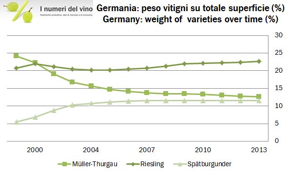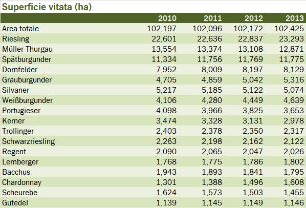 • La superficie vitata sta continuando a calare in modo graduale, siamo a poco meno di 99500 ettari vitati a fine 2013. Le tendenze dello scorso anno si sono ripetute, quindi i vini bianchi crescono. Il Riesling continua a crescere e rappresenta ormai il 22.7% della superficie vitata, quindi circa 23300 ettari vitati. Cala come negli scorsi anni il Muller Thurgau, al 12.6% della superficie totale, mentre sono in crescita tra i bianchi sia il Pinot Grigio, al 5.2% dal 4.9% dello scorso anno che il Pinot Bianco al 4.5% rispetto al 4.4%. Nei vini rossi ci sono meno variazioni nel tempo. Il Pinot Nero resta il vitigno più coltivato, all’11.5% della superficie totale, contro il 7.9% del Dornfelder e il 3.6% del Portugieser (in costante calo).