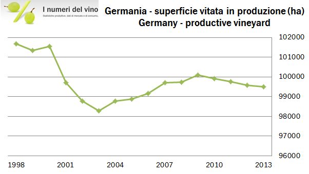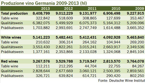 Apriamo l’anno con i dati sulla produzione 2013 della Germania, cui seguirà il post sul mercato tedesco. La vendemmia 2013 in Germania è stata meno generosa del 2012, a causa del ritardo con cui si è sviluppata l’annata. I vini, secondo il Deutsche Wine Institut da cui abbiamo ricavato questi dati, ha prodotto vini molto fruttati tra i bianchi, con una gradazione alcolica relativamente limitata, un buon mix rispetto a quello che il mercato richiede di questi tempi. Ma andiamo a vedere i dati nel dettaglio.