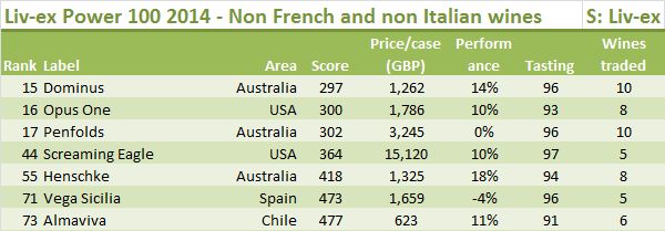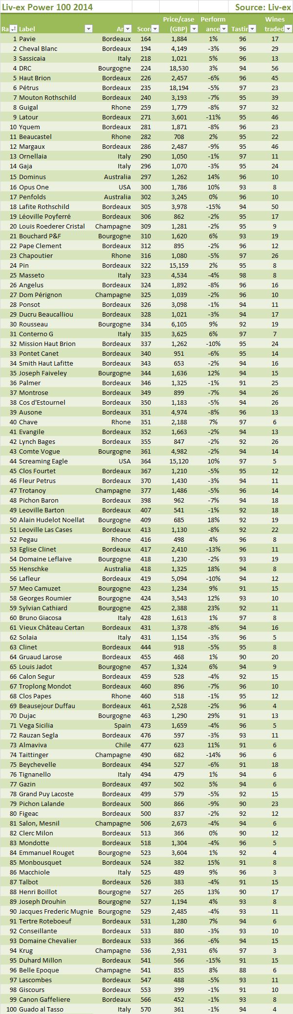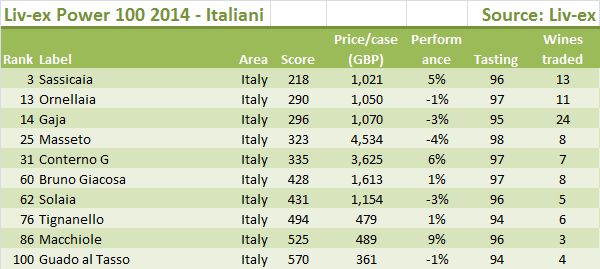 La novità più importante è che al numero 3 della classifica c’è Sassicaia (era il 39 lo scorso anno), con un prezzo medio di 1021 sterline per cassa (+5%), un punteggio di 96 e 13 annate trattate sulla piattaforma Livex. E’ la prima volta che un vino non francese fa una apparizione così in alto nella classifica. E’ un segnale importante della rinnovata forza dei vini di alta qualità italiani, che sono balzati all’attenzione di questi trader inglesi anche perchè non riescono più a fare soldi con quelli francesi. Si stanno dunque interessando al vino italiano che mai ha avuto una presenza così importante nella classifica: 13esimo Ornellaia (da 37esimo), 14esimo Gaja (non pervenuto lo scorso anno), 25esimo Masseto (che l’anno scorso al n.33 era il primo italiano), e poi ancora Giacomo Conterno al 31esimo, Bruno Giacosa al 60esimo, Solaia al 62esimo, Tignanello al 76esimo, Macchiole all’86esimo e Guado al Tasso al 100esimo. 10 vini in tutto, contro 7 del 2013 e 9 del 2012.