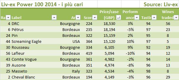 - Esiste anche un ranking sul numero delle bottiglie (quindi annate e tipi immagino) trattate, dove DRC straccia tutti con 56, seguita dai 50 di Lafite Rothschild e dai 46 di Latour e Margaux. Il primo italiano è Gaja con 24 prodotti trattati nel corso del 2014.