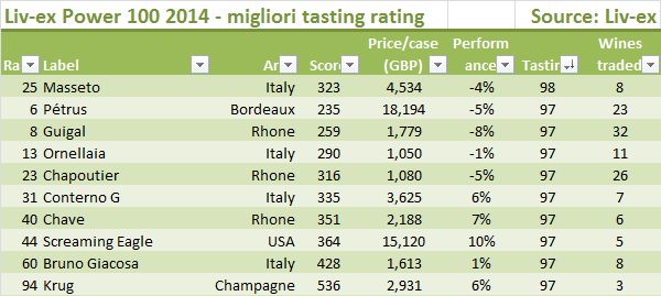 - Il vino più buono invece secondo questa classifica è Masseto, unico con un punteggio medio di 98/100 seguito da 9 vini a 97. Diciamo subito che i vini più buoni sono quelli italiani, dato che tra i “97” troviamo Giacomo Conterno, Bruno Giacosa e Ornellaia. In generale possiamo ben dire che se i vini di Bordeaux sono i più trattati, collezionati e cari, non sono certamente i più buoni, perchè nei 10 più buoni ce n’è solamente uno mentre sono 7 nella classifica come la fa Livex.