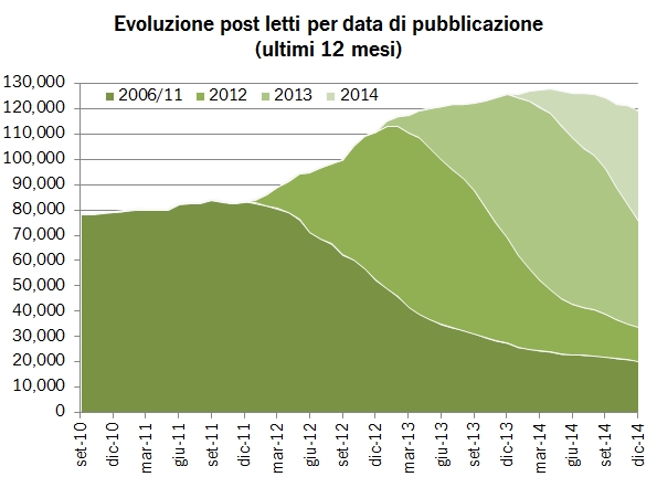 Per chi vuole, seguono un po’ di grafici che mostrano i principali trend dell’anno. Richiamerei la vostra attenzione su quello più grande che si chiama “Evoluzione post letti per data di pubblicazione” dove vengono analizzati soltanto i click sulle pagine “contenuto” (non sui menu o sulla front page) e dove potete chiaramente notare il trend discendente iniziato in primavera e, purtroppo, dovuto al minor “successo” in termini di lettori delle pagine pubblicate durante l’anno 2014.