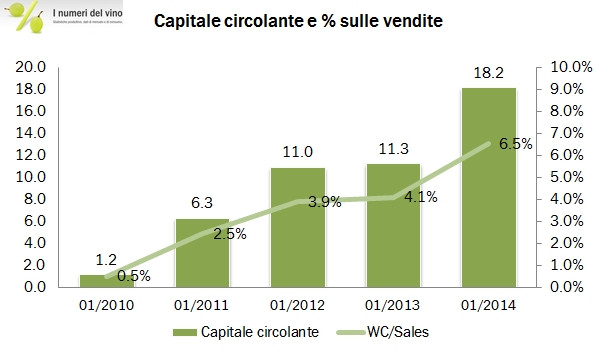 • La struttura finanziaria è molto equilibrata, praticamente l’azienda ha lavorato per anni senza debito e senza capitale circolante (quindi il valore del magazzino è stato coperto dai debiti verso i fornitori). In realtà negli ultimi anni l’attività ha visto un incremento del fabbisogno di circolante, che come vedete dall’ultimo grafico è salito al 6% delle vendite. Il valore del magazzino (a prezzo di costo) è circa il 20% del fatturato.