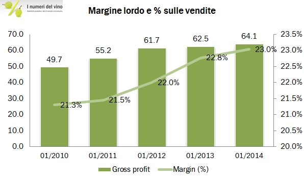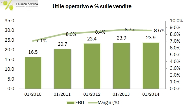 • I margini li potete vedere dai grafici, Majestic Wine ha una margine sul costo del venduto d circa il 23% nell’anno fiscale terminato a marzo 2014 su vendite di circa 278 milioni di sterline (350 milioni di euro circa). Ciò significa un ricarico medio del 30%. I costi di distribuzione sono circa il 10% del fatturato, le spese generali circa il 5%. Di conseguenza il margine operativo è dell’8% circa.