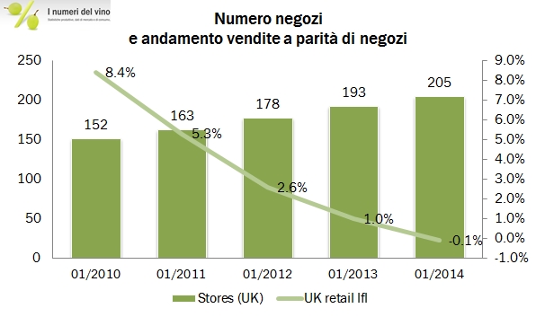 • Le metriche chiave sono un livello molto elevato fatturato per vendita, a 129 sterline, con 643mila clienti attivi su 205 negozi e l’11% di vendite online. Il valore medio per bottiglia è di 8 sterline (vini fermi) contro una media del mercato inglese di circa 5.4 sterline. Le vendite medie per negozio sono circa 1.25 milioni di sterline (1.6 milioni di euro).