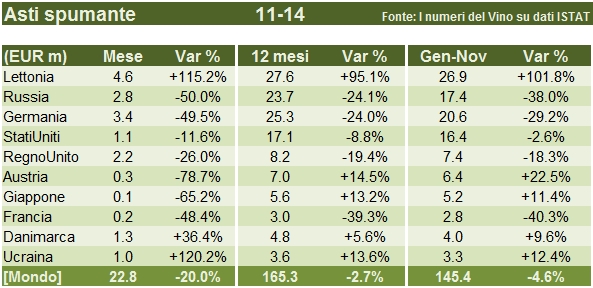 - Spaccando ulteriormente i dati dentro la categoria degli spumanti è utile per capire che cosa succede nel segmento. Il problema sono le esportazioni di Asti che stanno crollando in due mercati chiave: la Russia e la Germania. Il mese di Novembre è a -20%, le esportazioni da inizio anno sono a -4.6% e replicare la crescita a doppia cifra di dicembre 2013 non sarà facile. In Russia c’è un anche problema di cambio. La sostanza è che le esportazioni si sono dimezzate in Novembre, e quindi calano di un buon 25% se si considerano i 12 mesi. La perdita di fatturato russa è completamente compensata dalla crescita della Lettonia, che potrebbe anche essere un “mercato di passaggio” per la Russia. Il problema è però più ampio, dato che a non crescere più è anche il mercato americano e quello inglese (-18%).