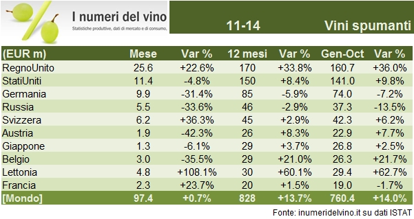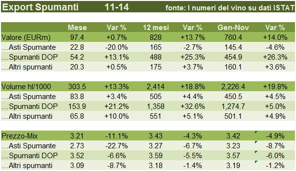 - Continua invece la crescita degli spumanti DOP, trainata dal Regno Unito (+48% nei primi 11 mesi), mentre il mercato americano (+24%) ha subito una battuta d’arresto nel mese. Tutto sommato le cose continuano ad andare bene, +13% nel mese e +25% sui 12 mesi.