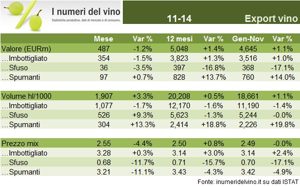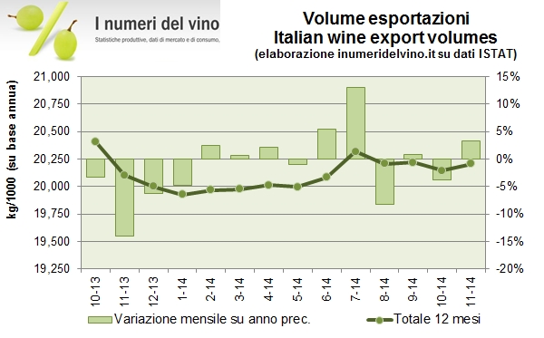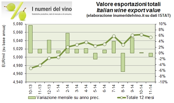 Novembre non è stato un buon mese per le esportazioni italiane, anche se nei post precedenti avevamo messo in luce come il fine anno era particolarmente difficile per l’Asti, data la sua esposizione al mercato russo. I dati sono leggermente negativi per le esportazioni nel complesso, per la terza volta in 11 mesi, lasciando il saldo annuale a circa +1%. Dicembre sarà una base di confronto piuttosto difficile (+4% lo scorso anno). Possiamo dunque ipotizzare che i dati annuali preliminari sulle esportazioni saranno improntati alla stabilità dei valori poco sopra 5 miliardi di euro, e del volume intorno a 20 milioni di ettolitri. La pressione sui volumi sarà poi destinata a proseguire nel 2015 data la vendemmia scarsa del 2014, anche se ciò potrebbe essere compensato dall’euro debole. Ma andiamo a leggere insieme i numeri a fine novembre 2014.