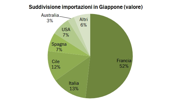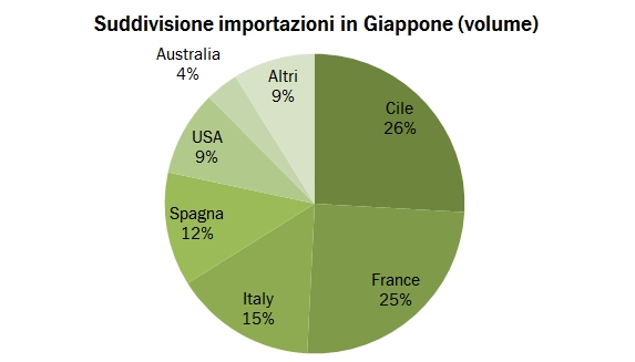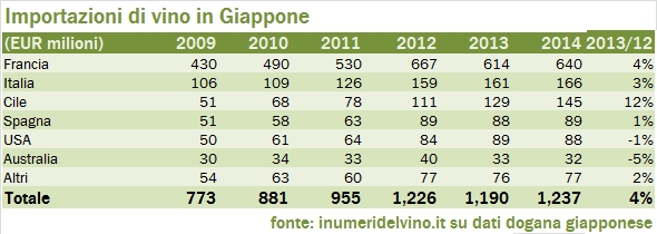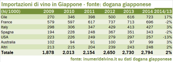 La svalutazione dello Yen non ha allontanato i consumatori giapponesi appassionati di vino. Questo è in sostanza il messaggio che deriviamo dall’analisi delle importazioni di vino in Giappone nel 2014. Sebbene il valore dell’import sia cresciuto in valore assoluto soltanto del 4% in Euro, anche nel 2014 il Giappone ha dovuto far fronte alla svalutazione del suo cambio (8% in media, voluta dalla politica monetaria del Governo, che ha l’obiettivo di far uscire l’economia dalla deflazione e dalla bassa crescita economica). Se facciamo un passo indietro e consideriamo la valuta locale, le importazioni sono cresciute del 13%, dopo essere cresciute del 23% lo scorso anno e del 20% nel 2012. In poche parole, i Giapponesi importano il 65% in più in valore nella loro valuta dal 2012 a questa parte. La metà di questa crescita se n’è andata una volta trasformata in Euro. Bevono di più o bevono meglio? Beh, in 3 anni i volumi sono cresciuti del 30%, praticamente uguale alla spesa in Euro. Quindi a quanto pare, il prezzo mix in Euro è rimasto uguale. L’Italia in questo contesto ha mantenuto le quote di mercato ma comincia a essere insidiata dal Cile. Andiamo nei numeri di dettaglio.