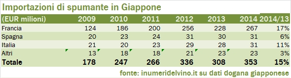 - Nel segmento degli spumanti la crescita 2014 è stata vorticosa, +15% in Euro e +24% in Yen. In realtà, se osservate il grafico il 2013 era stato particolamente negativo e si è trattato quindi di un recupero. Se osserviamo i dati su 3 anni come abbiamo fatto per il totale del vino ci accorgiamo che la crescita in Euro è stata del 33%, non distante dal +30% del mercato. La Francia resta il punto di riferimento. Sui 3 anni cresce del 33%, contro il 30% della Spagna (che resta il numero 2 ma praticamente allo stesso livello dell’Italia) e il 36% dell’Italia che ha raggiunto 31 milioni di euro di esportazioni (secondo la dogana giapponese).