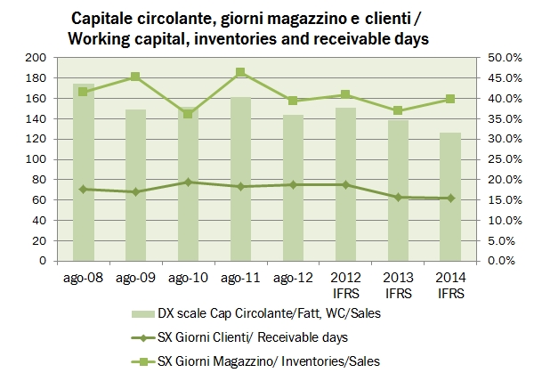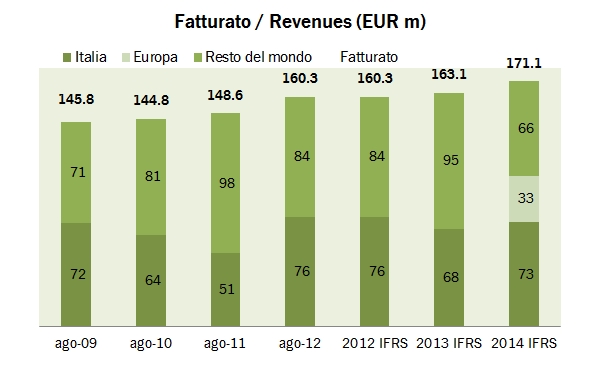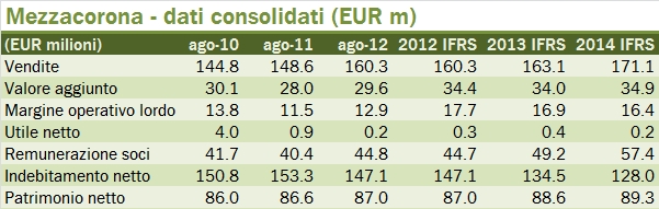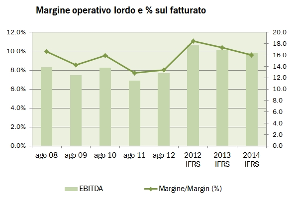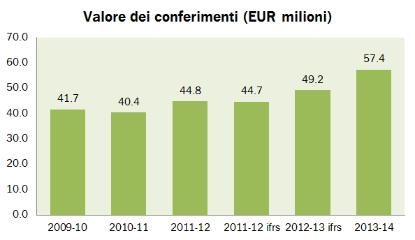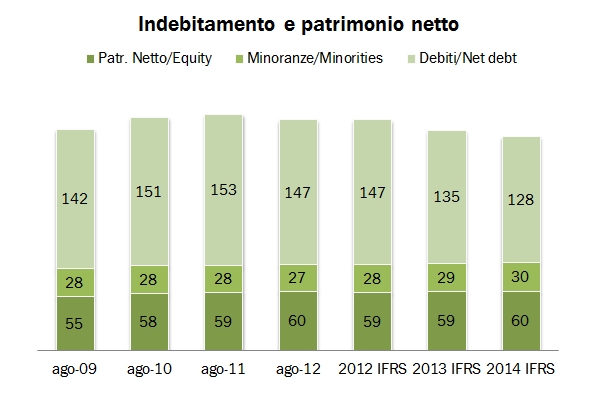 - Dal punto di vista finanziario, continua il graduale calo dell’indebitamento, sceso a 128 milioni di euro (-6 milioni rispetto al 2013) a fronte di un patrimonio netto di 89 milioni di euro. Il rendiconto finanziario mostra un livello di investimenti di 3.8 milioni di euro, in crescita rispetto agli 1.8 milioni registrati lo scorso anno.