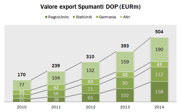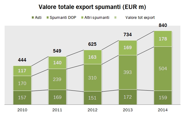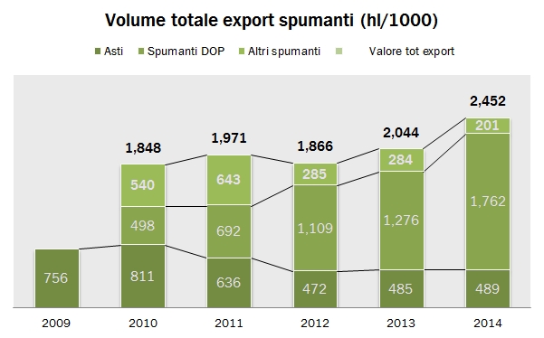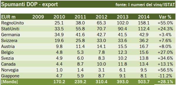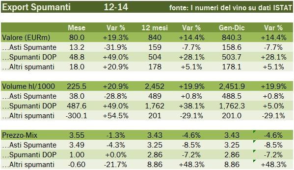Dopo aver analizzato le esportazioni di vino ci focalizziamo oggi sugli spumanti, con i dati preliminari di fine anno, che vedono il totale export a 840 milioni di euro e 2.45 milioni di ettolitri, rispettivamente in crescita del 14% e del 20% rispetto al 2013. Anche se i dati sono soggetti a qualche aggiustamento in corsa, si può sin d’ora concludere che è stato un anno glorioso per gli spumanti, e per gli spumanti DOP (+28%, Prosecco principalmente) che ha più che compensato l’arretramento dell’8% delle esportazioni di Asti (con volumi peraltro stabili). Cosa succederà nel 2015? Io vedo un aspetto positivo e uno negativo: il lato negativo è che tutta la crescita viene dai volumi di spumanti DOP, che sta beneficiando dell’allargamento delle aree destinate a questo prodotto ma che probabilmente non potrà continuare all’infinito. I volumi di export sono cresciuti per i DOP del 38% nel 2014 a 1.8 milioni di ettolitri. Per intenderci, nel 2010 erano 0.5 milioni di ettolitri. Il lato positivo sono certamente i cambi. Il Regno Unito e gli USA contano 330 degli 840 milioni di export, e genereranno probabilmente un effetto positivo di almeno il 4-5% durante il 2015. Andiamo a leggere insieme i numeri del 2014.