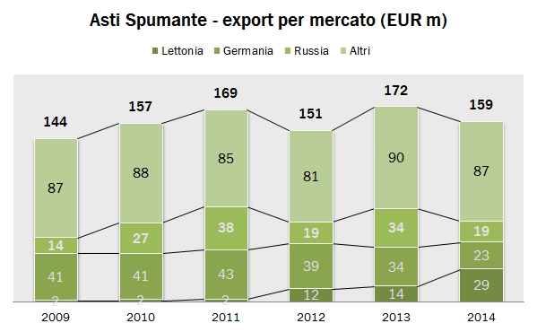 - L’Asti spumante ha invece una nuova casa, la Lettonia, come abbiamo già commentato negli ultimi mesi, che è raddoppiata nel 2014 da 14 a 29 milioni di euro. La Russia crolla del 45% e diventa il terzo mercato, la Germania resta il secondo mercato con un calo del 31%, a 23 milioni di euro (quasi la metà rispetto al picco storico di 43 milioni del non lontano 2011…). Continua il lento calo negli USA, che ha portato in pochi anni l’export da 25 a 17 milioni. Cosa commentare… grande volatilità che non consentono di avere una solida base di crescita. Infatti l’export totale di Asti ballonzola tra 140 e 170 milioni di euro da qualche anno ormai. Con un valore di 158 nel 2014, non è detto che nel 2015 le cose possano peggiorare ancora…