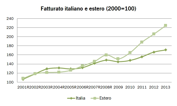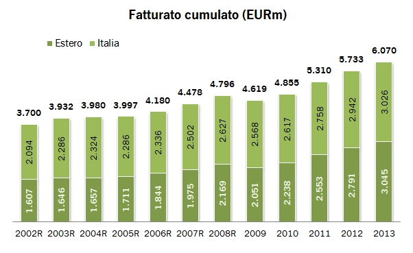 - Le prime 122 aziende e cooperative italiane (con oltre 25 milioni di fatturato) hanno fatturato 6.1 miliardi di euro, di cui 3.04 miliardi all’estero e 3.02 miliardi in Italia, rispettivamente +9% e +3%. Una piccola particolarità: nel 2013 il fatturato delle cooperative è cresciuto del 7%, un po’ di più delle aziende private (escluse quelle a controllo estero).