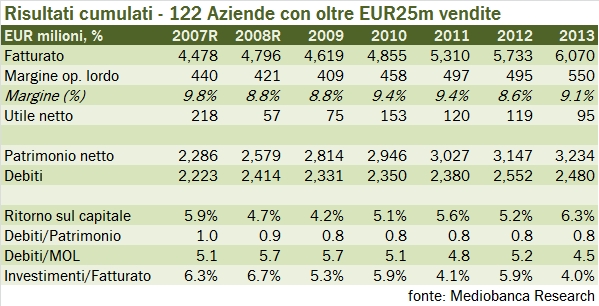 Il rapporto di Mediobanca, pubblicato in corrispondenza del Vinitaly, evidenzia gli ottimi risultati ottenuti nel 2013 dalle maggiori cantine italiane, come abbiamo anche noi testimoniato azienda per azienda negli ultimi mesi. Il fatturato è stato spinto dalle esportazioni da un lato (ricordiamo che queste 122 aziende rappresentano il 60% delle esportazioni italiane di vino) e dai prezzi in crescita in Italia, causa l’incremento dei prezzi del vino sfuso. I numeri del 2013 si possono così riassumere: fatturato in crescita del 6%, margine operativo lordo +11%, utile operativo +19%. L’utile netto, meno rappresentativo scende a causa delle componenti non operative. Migliora anche la struttura finanziaria, con un debito in calo in valore assoluto (aiutato anche da una annata magra in termini di investimenti), ma ancora di più in confronto alla generazione di cassa. Il rapporto con il MOL scende a 4.5 volte, il valore più contenuto dal 2006 a questa parte. In conclusione, il 2013 è stata una buona annata per il vino italiano. Il 2014 promette ancora bene, anche se le prime indicazioni sul fatturato di queste aziende sono di una crescita inferiore al 2%: il calo dei costi delle materie prime dovrebbe aver consentito un ulteriore miglioramento dei margini. Andiamo nel dettaglio dei numeri.