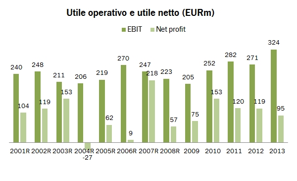 - Il settore ha subito un incremento dei costi esterni del 5.5%, del costo del personale del 4% (a fronte di un organico praticamente stabile, 11536 dipendenti per queste 122 aziende), degli ammortamenti dell’1% (anche a fronte di investimenti piuttosto contenuti). Si arriva così a un margine operativo lordo di 550 milioni di euro, pari al 9% dei ricavi, e a un utile operativo di 324 milioni di euro, il 5.3% dei ricavi. Un ottimo risultati, naturalmente pari al “massimo storico”, che si confronta forse con una annata non molto positiva come fu il 2012 (potete vedere in tabella il leggero regresso registrato).