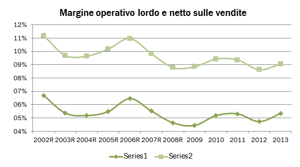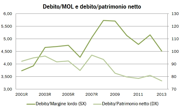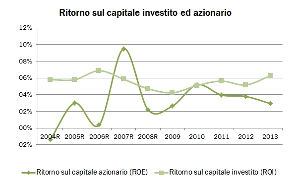 - La conseguenza di tutti questi numeri è un visibile miglioramento del ritorno sul capitale, che sale dal 5.2% al 6.3%, che considerata la presenza delle cooperative non è male. Le sole aziende sono infatti nel 2014 intorno all’8% un numero che suona molto bene dato che intorno all’8% è il valore storicamente richiesto nell’investimento nelle aziende (di questi tempi meno, per via della mancanza di inflazione e dei tassi praticamente nulli, ma questo non è il luogo di queste disquisizioni).
