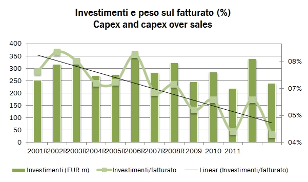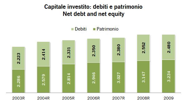 - Abbiamo detto che gli investimenti sono molto contenuti, 240 milioni di euro, praticamente allineati al “consumo di capitale”. Ciò determina il calo del debito passato da 2.55 a 2.48 miliardi di euro. Il rapporto con il patrimonio netto scende al 77%, il livello più basso di sempre, mentre in rapporto al MOL si passa da 5.2 a 4.5 volte, un numero che non si vedeva dalla metà degli anni 2000.