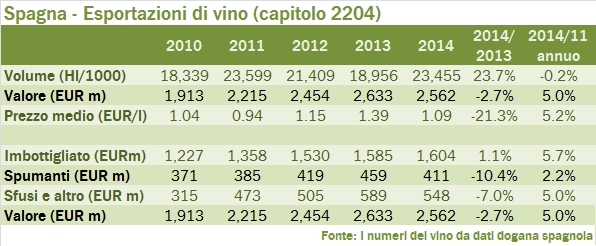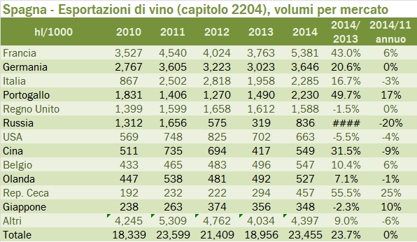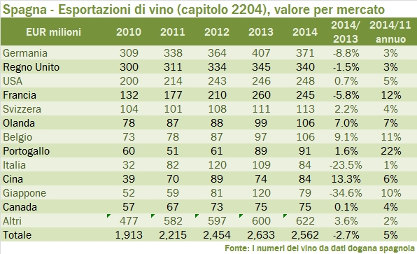 La Spagna si è ripresa nel 2014 il primato delle esportazioni mondiali per volume, a fronte della ricchissima vendemmia 2013 (trovate qui i dati) con un valore provvisorio di 23.4 milioni di ettolitri. Si è però più trattato di “smaltire” l’eccesso di produzione, dato che il valore delle esportazioni è addirittura sceso del 3% rispetto allo scorso anno. Dove è andato tutto questo vino in eccesso? Principalmente in Francia e in Portogallo, ma anche in Germania e un po’ nel nostro paese. Quando guardiamo i valori, però, per trovare dei trend sani di crescita dobbiamo scendere nella graduatoria dei mercati per arrivare al Belgio e all’Olanda, entrambi poco più di 100 milioni sui 2.6 miliardi di export totale. Dico questo per passarvi il messaggio che dati come questi mostrano la “casualità” dei mercati di destinazione, come se il vino spagnolo (soprattutto quello sfuso) dovesse ogni anno trovarsi un nuovo mercato dove vendere. Nel segmento dei vini imbottigliati i dati sono più costanti e mostrano il progresso del vino spagnolo in Cina, dove ci superano (72 milioni di euro contro i nostri 57 milioni). Nel segmento degli spumanti dopo diversi anni di crescita, il 2014 si è chiuso con una correzione del 10%, caratterizzato dal crollo nel mercato tedesco, americano e giapponese, non compensato dalla crescita degli altri paesi. Leggiamo i dati in dettaglio nel resto del post.