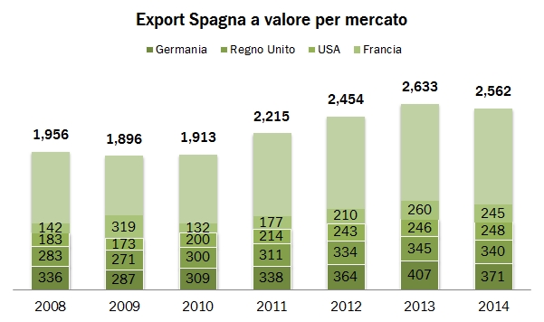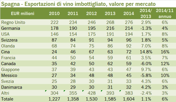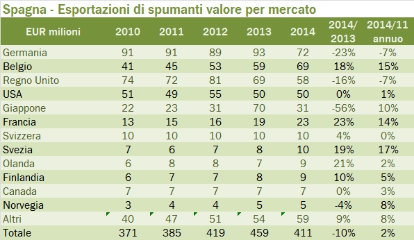 - Negli spumanti, la Germania resta il primo mercato con 72 milioni di euro ma crolla del 23%. Il Belgio cresce a 69 milioni di euro e diventa il secondo mercato per il prodotto iberico, superando il Regno Unito, in calo del 16% a 58 milioni di euro. Anche in Giappone, dopo un forte exploit nel 2013, le esportazioni sono tornate al livello del 2012, dimezzandosi.
