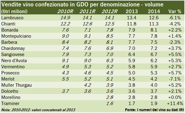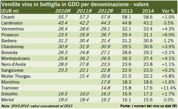 - Venendo alle denominazioni, la leadership del Chianti non è in discussione, +1% nel 2014 e +5% negli ultimi 5 anni. Arretra invece del 3% il Lambrusco (0% sui 5 anni), mentre i 3 vini in chiara crescita nella top ten della grande distribuzione sono il Vermentino, 33 milioni di euro di vendite e +4% nel 2014 (+27% sui 5 anni), il Prosecco a 31 milioni (+6% e +33% rispettivamente a 1 e 5 anni) e, udite udite, la Bonarda, che cresce solo del 2% nel 2014 ma è a +11% negli ultimi 5 anni.
