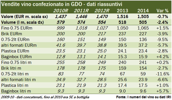 - Come dicevamo il fatturato della GDO nel vino è sceso dello 0.7% a 1,505 milioni di euro, stante una riduzione dei volumi del 2.4% a 505 milioni di litri e un incremento del prezzo medio dell’1.7% a 2.98 euro al litro.