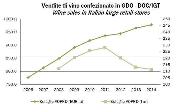 Non è con poco stupore che leggo il titolo del comunicato stampa di Vinitaly sull’argomento che trattiamo oggi, e che dice: “VENDITE DI VINO NELLA GRANDE DISTRIBUZIONE IN LEGGERA RIPRESA NEL 2014 – SEGNALI INCORAGGIANTI PER IL 2015”. Se guardate il grafico qui sopra vi potete subito rendere conto che, in realtà, il 2014 è stato il primo anno da 10 a questa parte che le vendite non crescono ma calano (-0.7%). Perchè è successo? Perchè il forte calo dei listini all’ingrosso si è ribattuto sui prezzi di vendita, e quindi di fronte a un mercato comunque calante in volume (-2.4%) i prezzi non sono riusciti a compensare. Il 2014 in realtà non è andato così male, perchè sarebbe giusto dire che il 2012 e il 2013 erano stati anni peggiori, che però sono stati “salvati” dai forti incrementi di prezzo (non necessariamente di utilli per chi ha prodotto vino!). Ma la sfida vera sarà il 2015, perchè l’inerzia dei prezzi in rallentamento (non solo del vino, ma di tutto), combinata con il calo strutturale dei volumi è molto probabile che si traduca in anno con un calo forse più pronunciato del 2014… vedremo.