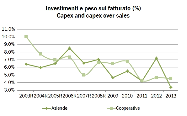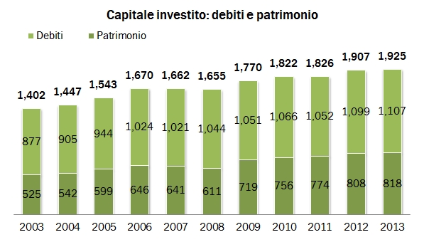 • I risultati reddituali sono meno importanti per le cooperative che non per le aziende. Forse vale la pena di dire che nell’ambito di un equilibrio del conto economico (6 milioni di utile contro 2.5 miliardi di fatturato), i “consumi” esterni, nel qual computo ricadono anche le liquidazioni per i soci dei loro apporti, sono cresciuti del 7.4% nel 2013, contro un +4% annuo nel 2003-13. La dinamica del costo del personale segna un +3% (nonostante il personale sia calato in numero assoluto), quella del consumo di capitale (ammortamenti) +1.5%, mentre gli oneri finanziari sono invariati.