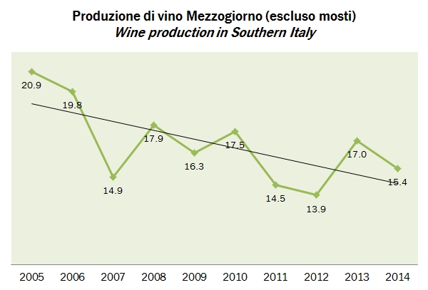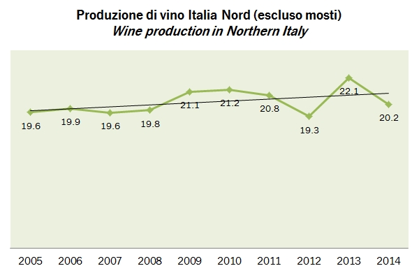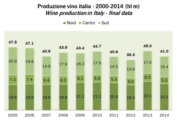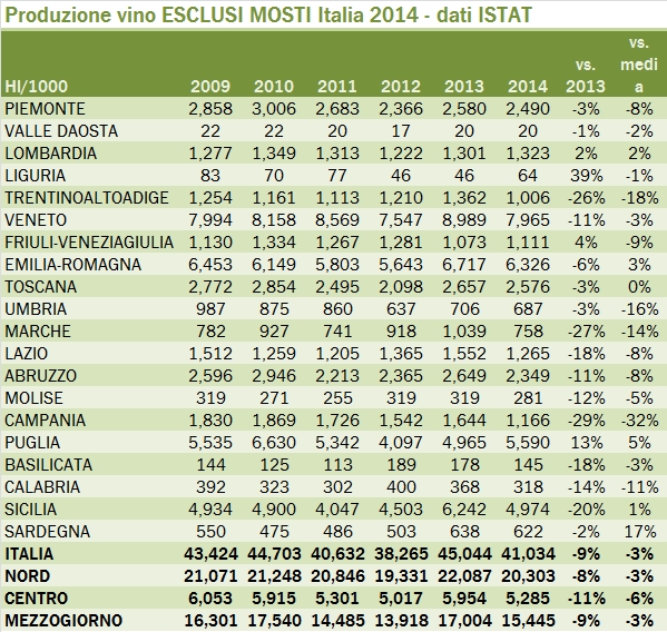 - La produzione di vino escluso mosti in Italia è di circa 41 milioni di ettolitri, in calo del 9% contro il 2013 e del 3% sotto la media degli ultimi 5 anni, di poco superiore a 42 milioni di ettolitri.