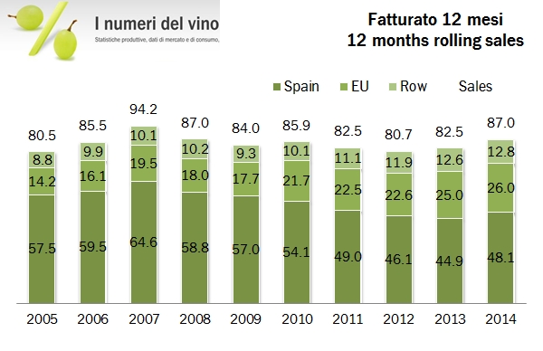 • Le vendite crescono del 5.4% a 87 milioni di euro, di cui 80 milioni sono vino imbottigliato (+3%).