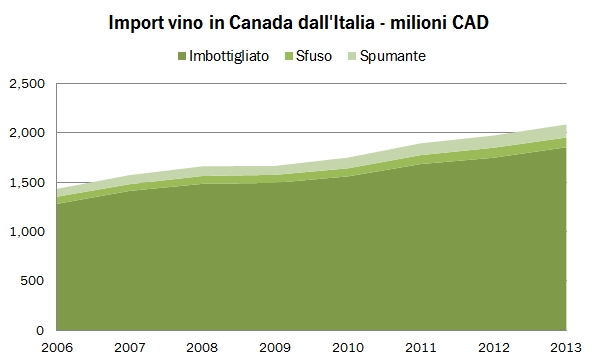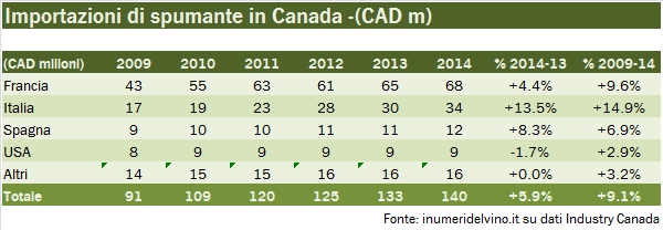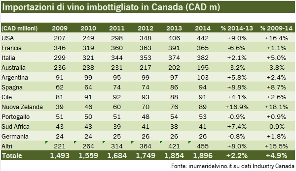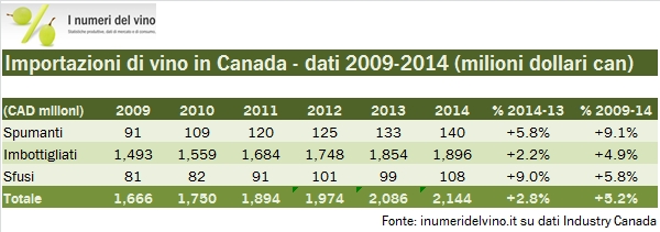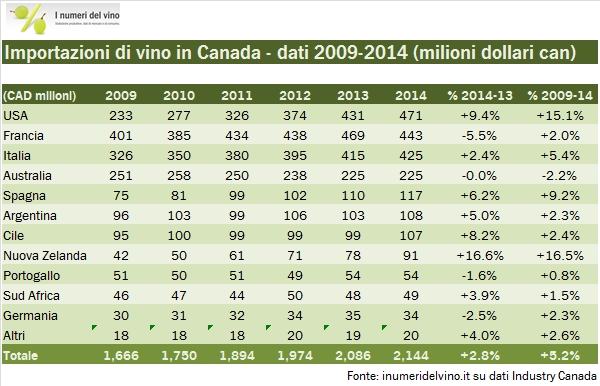 Le vicissitudini professionali di queste settimane mi hanno portato proprio ad aggiornare i dati relativi al vino canadese, ritrovandomi una buona base di dati da analizzare. Oggi guardiamo alle importazioni di vino del Canada per il 2014, come pubblicate da Industry Canada. I dati sono molto chiari: primo, il mercato canadese è restato un buon mercato per gli esportatori di vino, con una crescita in valuta locale del 3% nel 2014 raggiungendo 2.1 miliardi di dollari e del 5% sugli ultimi 5 anni, nonostante la nazione stia subendo l’impatto del ciclo discendente delle materie prime, la cui economia è particolarmente legata. Chiaramente, stiamo parlando di numeri in dollari canadesi, che contro l’euro ha perso mediamente il 7% per due anni di fila, il 2013 e il 2014. Quindi se dovessimo metterci nei panni di chi esporta in Canada +3% in valuta locale è -4% in euro. Dunque, chi vince e chi perde? Beh, l’Italia pareggia (ma vince nei vini spumanti), gli USA vincono (e lo avevamo visto qualche tempo fa con l’export americano di vino), la Francia perde. Tra i “comprimari”, sembra essersi fermata l’emorragia australiana, mentre stanno salendo forte (da valori molto contenuti) gli spagnoli e i neozelandesi. Andiamo a leggere i numeri insieme.