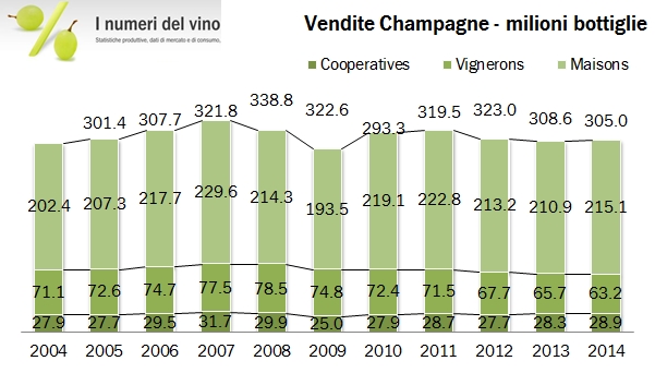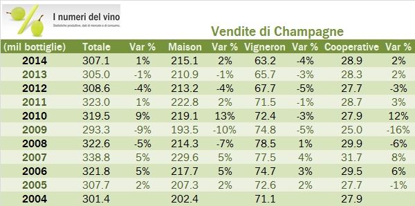 Con un fatturato globale annuo di 4.5 miliardi di euro e 307 milioni di bottiglie spedite nel 2014 lo Champagne consolida la sua posizione di leadership nel mondo dei vini spumanti. Due sono le cose importanti da “portare a casa” da questo post: (1) la crescente concentrazione dell’attività nelle mani dei grandi operatori. Le maison hanno rappresentato nel 2014 il 70% delle spedizioni e i primi 5 operatori fanno il 39% del totale; (2) il costante declino del mercato francese, che credo per la prima volta sia stato definito dal Comté Champagne “déclin sans doute durable”, strutturale per farla breve. Crescono in compenso alcuni mercati, un po’ per il rimbalzo delle economie (Italia e Spagna per esempio), ma soprattutto per la globalizzazione dei consumi di Champagne, che hanno trovato per esempio in Australia un mercato più grande dell’Italia. Leggiamo i numeri insieme, con una piccola chicca per chi arriva fino in fondo…