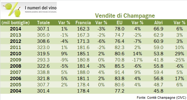 - Le spedizioni totali di Champagne ammontano a 307 milioni di bottiglie, con un incremento dell’1% rispetto al 2013.