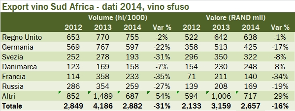 - Il calo dei volumi è soprattutto concentrato nei vini sfusi, che calano nel 2014 da 4.2 milioni di ettolitri a 2.9 milioni. Va detto che il 2013 era stato un anno di volumi eccezionalmente alti. L’unico tra i grandi mercati del vino sfuso che non perde quota è proprio il Regno Unito, dove vengono esportati circa 0.8 milioni di ettolitri per un fatturato di 640 milioni di Rand. A livello di valore il vino sfuso Sudafricano ha subito un calo del 16% a 2.7 miliardi di Rand.