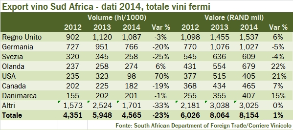 La svalutazione del Rand negli ultimi due anni ha senz’altro reso più competitivo nel mondo il vino Sud Africano. La valuta locale è passata tra il 2012 e il 2014 da 10.5 Rand per un euro a 14.39, per ritornare in questi primi 3 mesi del 2015 a 13.1. Ne hanno beneficiato soprattutto le esportazioni di vino imbottigliato, che hanno toccato il record storico di circa 380 milioni di euro nel 2014, compensate invece dal calo delle esportazioni di vino sfuso, interamente dovuto ai volumi. Il quadro generale del 2014 è dunque di un’export di vini fermi in valuta locale (Rand) stabile, a circa 8.2 miliardi di Rand, che corrispondono a 567 milioni di euro, se convertiti al cambio medio dell’anno. Il Regno Unito resta il mercato chiave per il vino Sud Africano, e proprio in questo mercato i prodotto continua a funzionare. Ci sono invece segni di debolezza sia in Germania (dove però il 2013 era stato un anno glorioso) e in Svezia… ma andiamo insieme a leggere qualche numero.