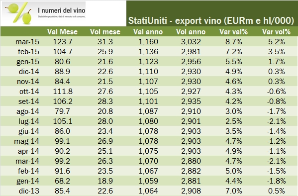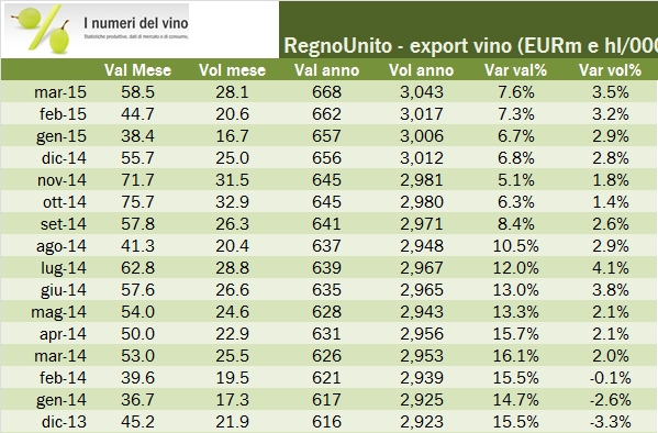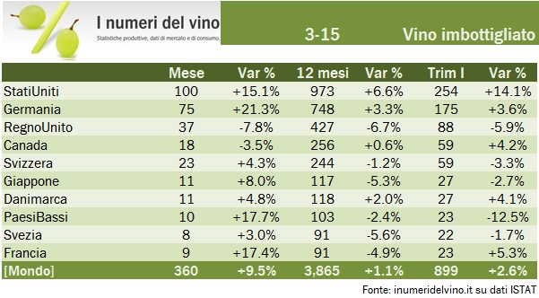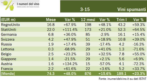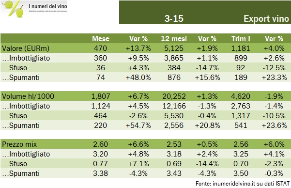 - Riassumiamo quindi il primo trimestre, fatto di una partenza lenta e di un marzo molto forte, supportato da una crescita del 10% nei vini imbottigliati, del 4% dei vini sfusi (primo dato positivo da oltre 1 anno a questa parte) e da un balzo del 48% dei vini spumanti, che potrebbero aver beneficiato della tempistica della Pasqua (più “bassa” nel 2014, quindi con alcune vendite che potrebbero essere cadute nel mese di febbraio). Ma di questo parleremo in altra occasione.