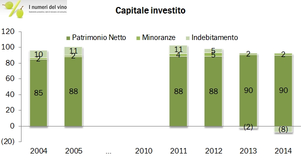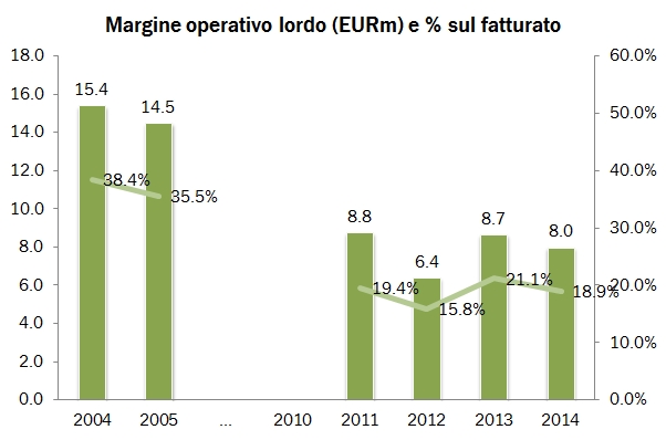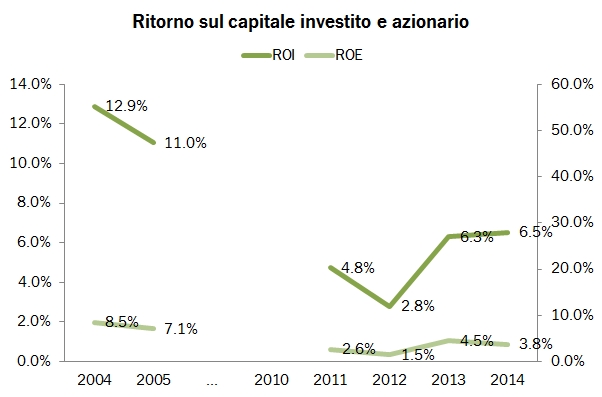 • Il capitale investito scende dal 2011 a questa parte. Ha toccato 84 milioni di euro nel 2014, con un capitale circolante di 54 milioni di euro e immobilizzazioni scese a 42 milioni. L’indebitamento si è cancellato. Da 11 milioni di euro del 2011, è sceso di circa 6-7 milioni di euro tutti gli anni ed è ora “ribaltato” in 8 milioni di cassa netta. Ciò ha messo decisamente sotto pressione i ritorno sul capitale dell’azionista, che non ha potuto beneficiare di alcuna leva finanziaria o nuovo investimento.