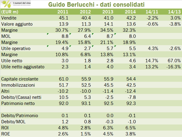 Oggi riprendo in mano i numeri di una famosa azienda spumantistica italiana, Guido Berlucchi. Ci riesco grazie a un buon samaritano che mi ha procurato i bilanci, che invece non ho ricevuto dall’azienda. Siccome sono diversi anni che non la guardiamo, vale la pena una “re-introduzione con commento”. Azienda di dimensioni molto significative della Franciacorta (oltre 40 milioni di fatturato contro 28 milioni di Ca del Bosco, per intenderci), piccola esposizioni ai vini fermi (soprattutto toscani), margini elevati (circa il 20%, una volta, molto elevati, oltre il 30%), fatturato in leggero recupero di recente ma chiaramente impattato dalla crisi italiana (-17% tra il 2010 e il 2012), cui l’azienda è esposta per la quasi totalità del business (o almeno lo immagino, non essendoci una suddivisione del fatturato). Negli ultimi anni la strategia si è focalizzata sulla dismissione di attività non caratteristiche (ospitalità), e sul contentimento del capitale circolante, che hanno prodotto un prodigioso milgioramento della struttura finanziaria. Con 8 milioni di euro in cassa a fine 2014 è solidissima, ma la crisi italiana gli ha tarpato le ali dello sviluppo del business… sarebbe ora di mettere tutta questa potenza di fuoco al lavoro…
