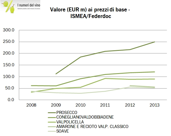 - La seconda DOC è Conegliano Valdobbiadene, di nuovo a volume e a valore. 589mila ettolitri prodotti nel 2013 sono il massimo storico anche in questo caso, così come i 121 milioni di euro di valore ai prezzi di base.