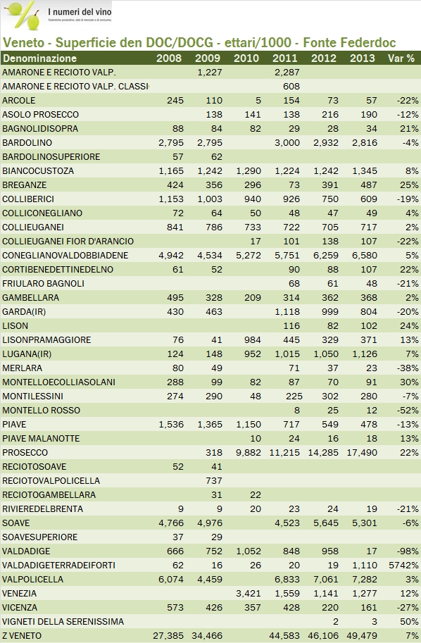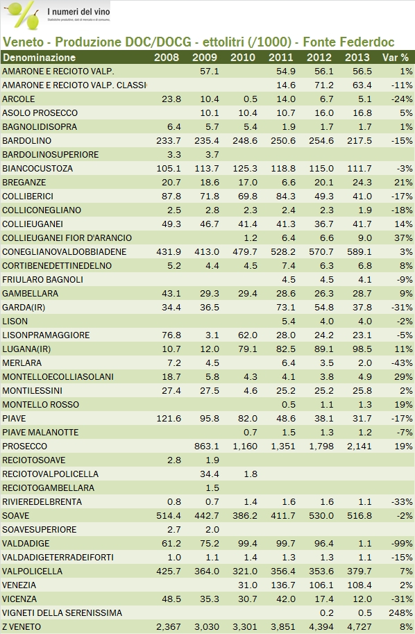 - La produzione di DOC venete nel 2013 è stimata da Federdoc a 4.7 milioni di ettolitri, anche se tale dato include alcune DOC come il Prosecco, il Lugana o il Garda che sono in realtà coltivate anche in altre regioni. Il dato è quindi da prendere con le molle. A titolo di riferimento, ISTAT ha accreditato al Veneto 4.2 milioni di ettolitri di vino di qualità.