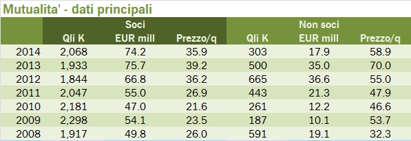 E i soci? Nel 2014 hanno incassato quasi lo stesso ammontare dello scorso anno, con una riduzione dell’introito per quintale (-8%) dovuta all’evidente calo dei costi delle materie prime e all’eccezionalità della remunerazione pagata dalla cooperativa nel 2013. Sono invece molto calati gli acquisti esterni (-50%).