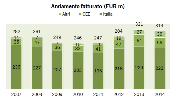 - Le vendite sono scese del 2% a 314 milioni. Senza Cesari, riteniamo che il fatturato sarebbe calato del 10% circa. Le vendite in Italia (totali) sono scese del 3%. Se però restringiamo il confronto al vino, cioè circa 226 milioni, troviamo un -5% in Italia a 159 milioni e un +25% all’estero a 67 milioni di euro. Ciò naturalmente includendo i 24 milioni di Cesari che c’è da immaginare siano soprattutto all’estero, dato il tipo di prodotto dell’azienda.