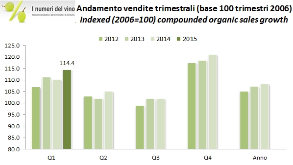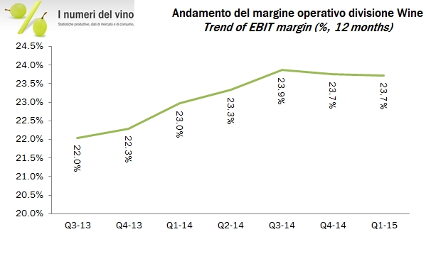 - I volumi di vendita di vino e spirits sono in crescita del 4% a 15.7 milioni di casse, il che lascerebbe intendere un prezzo-mix stabile. Se portiamo i dati su scala annua siamo a circa 66.6 milioni di casse. L’acquisizione di Maiomi dovrebbe dunque aggiungere nei prossimi trimestri circa 1% ai volumi consolidati di vino e spirits.