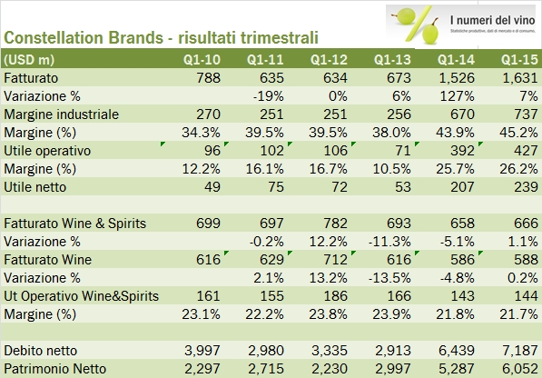 Titolo del post: “A tutta birra”. Questo è quello che si deduce dai risultati del primo trimestre di Constellation Brands, che ha deciso di alzare la previsione di utili a febbraio 2016 del 5% e a stimare un incremento dell’utile per azione del 10% (a 4.8-5.0 dollari per azione da 4.55-4.75 in precedenza). Ma le novità non si fermano qui, perchè se la birra cresce a doppia cifra, anche il segmento vino non va male. Le vendite nel mercato USA sono in crescita del 4% circa (sia in termini di vendite al dettaglio che di fatturato organico per il gruppo), il miglior risultato da diversi trimetri a questa parte. Infine, CB ha anche announciato una acquisizione di un brand vinicolo per 315 milioni di dollari. Si tratta del marchio Meiomi, un Pinot Noir in rapida crescita (da 60mila a 600mila casse tra il 2010 e il 2014), che ben si integra nel portafoglio del gigante americano. Se le previsioni del management sono corrette, l’acquisizione dovrebbe portare a un incremento dell’utile per azione di 3-4 centesimi già nell’anno fiscale terminante a Febbraio 2016 (e rappresenterebbe così circa un sesto dell’incremento annunciato). Tornando ai risultati, le vendite crescono del 7%, il gross margin del 10%, l’utile operativo del 9% e l’utile netto del 15%, sfruttando l’impatto benefico della leva finanziaria. Ma andiamo in dettaglio.