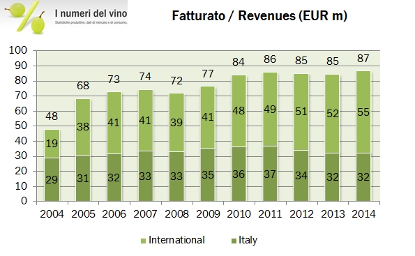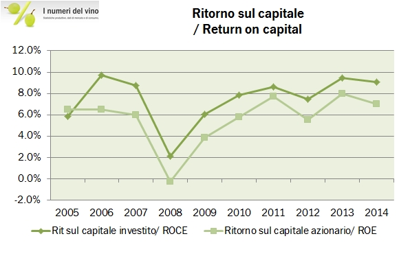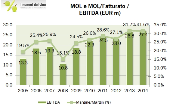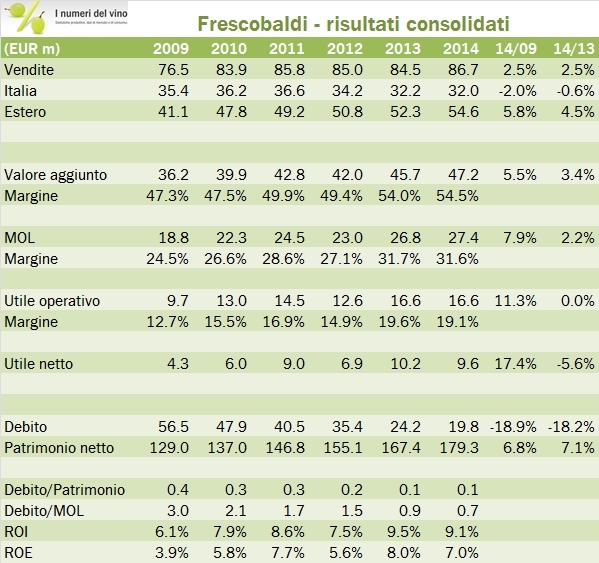 Frescobaldi ha mantenuto nel 2014 un livello di utili molto simile al 2013, portando a casa un ulteriore calo dell’indebitamento finanziario, ormai ben sotto 1 volta il MOL. L’azienda ha continuato gli investimenti produttivi (14 milioni nel 2014), ma ha anche investito circa 2 milioni di euro in una joint venture per gestire ristoranti, con l’obiettivo presumibilmente di sostenere e promouovere il marchio nelle grandi città europee. A differenza di altre realtà sinora analizzate, Frescobaldi continua a faticare sul mercato italiano, dove le vendite non sono cresciute nel 2014, mentre i mercati esteri continuano a crescere: hanno ormai raggiunto il 63% delle vendite. Poco si dice sull’andamento del business nel 2015, salvo che la sua evoluzione è allineata al budget. Vista la svalutazione dell’Euro, il miglioramento delle prospettive del mercato e i nuovi investimenti, ci sarebbe da aspettarsi un budget di crescita, e quindi un buon anno… vedremo.