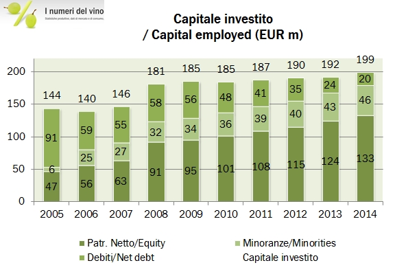 - Passiamo alla generazione di cassa. Frescobaldi ha investito circa 14 milioni di euro nel 2014 (quindi ben oltre il livello degli ammortamenti di 10 milioni), con la parte più significativa relativa all’ampliamento dell’impianto presso Le Sieci (FI). Va poi notato un investimento di circa 2 milioni in una joint venture per aprire una serie di ristoranti di alto livello nelle principali città europee (il primo già a aperto a Londra, mi pare di averlo visto in una traversa di Regent Street, vicino Piccadilly Circus).