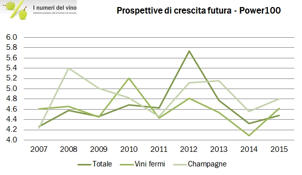 - Concludo menzionando il grafico sulle prospettive future, dove la media del punteggio per la catagoria del vino migliora, di più del punteggio per il settore in generale. Siamo quindi tornati in una situazione in cui le attese di crescita del settore vino e spumanti sono leggermente migliori del resto.